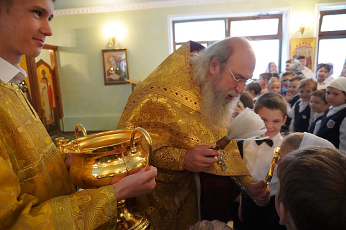 Торжественную службу в этот знаменательный день возглавил духовный попечитель гимназии, настоятель Покровского храма в Ясенево архимандрит Мелхиседек, которому сослужил иерей Роман Смирнов. В праздничной и благоговейной атмосфере юные ученики стали полноправными членами нашей большой гимназической семьи. По традиции, архимандрит Мелхиседек вручил каждому первокласснику памятный значок гимназиста.